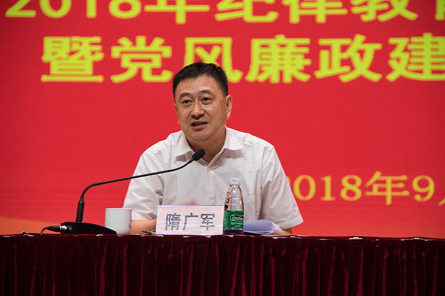 最后,隋广军强调,全校各级党组织和全体党员干部教师:一要讲政治,明方向。自觉提高政治能力,善于从政治上观察和处理问题;要严明政治纪律和政治规矩,对“七个有之”问题高度警觉,切实增强政治敏锐性和政治鉴别力。二要讲责任,强担当。学校各单位和二级党组织负责人要切实履行第一责任人职责,班子其他成员要担负“一岗双责”,正确对待手中的权力和责任,牢固树立齐心协力、同抓共管、共同担当的意识;强化责任的落实和考核,坚决消除一些党员干部精神上的慵懒、散漫、懈怠,消除“干多错多,不如不干”的错误思想。三要讲规矩,守纪律。把纪律和规矩挺在前面,认真学习遵守党章党规,严格按照规章制度办事,自觉做到遵守党的纪律不动摇,执行党的纪律不走样,时刻用党的纪律严格要求和约束自己。严肃换届纪律,加强换届纪律教育和监督,严防 “带病提拔”。四要讲正气,严作风。严格落实中央八项规定精神,紧盯“四风”问题新动向,严肃查处顶风违纪问题,对于师德师风问题采取“一票否决”、“零容忍”的态度,绝不姑息。坚持求真务实的工作作风,认真落实监督执纪“四种形态”特别是谈话提醒工作,经常提醒广大干部、教师遵纪守规,共同营造学校守纪律、讲规矩的良好氛围。