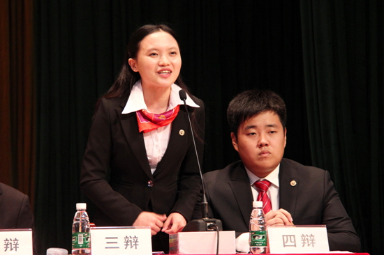 反方三辩在上场比赛中表现上佳,本场比赛她亦以“柔中带刚”的个人风格成为全场焦点,她犀利提问反方三辩“教育能作用于全部人吗?”在反方给出教育起决定作用,但却存在范围不广、深度不够的缺陷时,她迅速作出反应,指出制度可以作用于全部人,“对于那些想贪、敢贪的人,我们用制度打败他,让他不敢贪不能贪;对于那些本身廉洁的人,我们为他创造氛围。对方辩友,我们才是有深度,有广度,您认为呢?”反方三辩驳斥对方观点一针见血,赢得了全场的掌声。