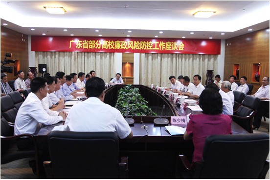 本网讯 10月24日,广东省委常委、省纪委书记黄先耀莅临我校,出席在我校南校区行政楼第三会议室召开的高校反腐倡廉及廉政风险防控工作座谈会。黄先耀强调,高校要培育好校园廉洁文化引领好社会风气,严格把好招生录取、基本建设、物资采购、财务管理、科研经费、校办企业、学术诚信七个“监督关口”。