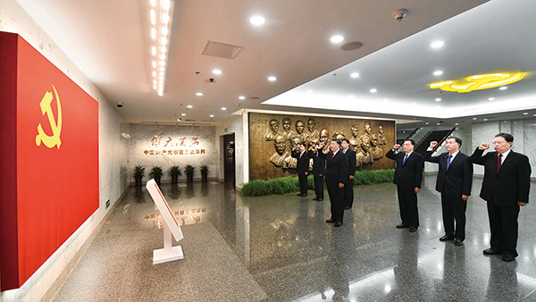 2017年10月31日,中共中央总书记、国家主席、中央军委主席习近平带领中共中央政治局常委李克强、栗战书、汪洋、王沪宁、赵乐际、韩正,瞻仰上海中共一大会址和浙江嘉兴南湖红船。这是31日上午,在上海中共一大会址纪念馆,习近平带领其他中共中央政治局常委同志一起重温入党誓词。新华社记者 李涛/摄